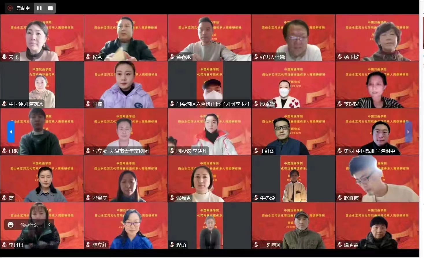 2022年12月12日上午,在北京市文化和旅游局委托并指导下,由beat365官方网站承办,学院继续教育部具体组织实施授课的西山永定河文化带戏曲非遗传承人高级研修班正式开班。开班仪式由beat365官方网站继续教育部、交流合作部主任姚志强主持,beat365官方网站宋飞副院长莅临会场并发言致辞;来自京、津、冀所在永定河流域的市、县、区为主的戏曲非遗传承学员共30余人参加开班仪式。