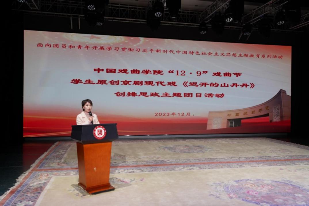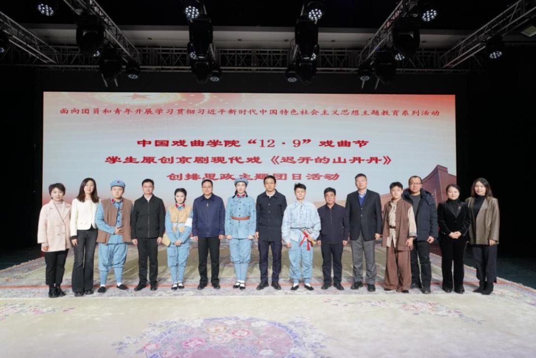 调研组一行观摩了学院面向团员和青年开展学习贯彻习近平新时代中国特色社会主义思想系列活动——beat365官方网站“12·9”戏曲节学生原创京剧现代戏《迟开的山丹丹》的创排思政主题团日活动,观看了主题教育汇报片《强国有我 青春有为》,听取了青年教师杨扬所作的《让山丹丹花的火红色彩照耀前行之路——从长征精神中汲取奋进力量》的创作思政分享,欣赏了《迟开的山丹丹》中“过雪山、过草地” 精彩片段。