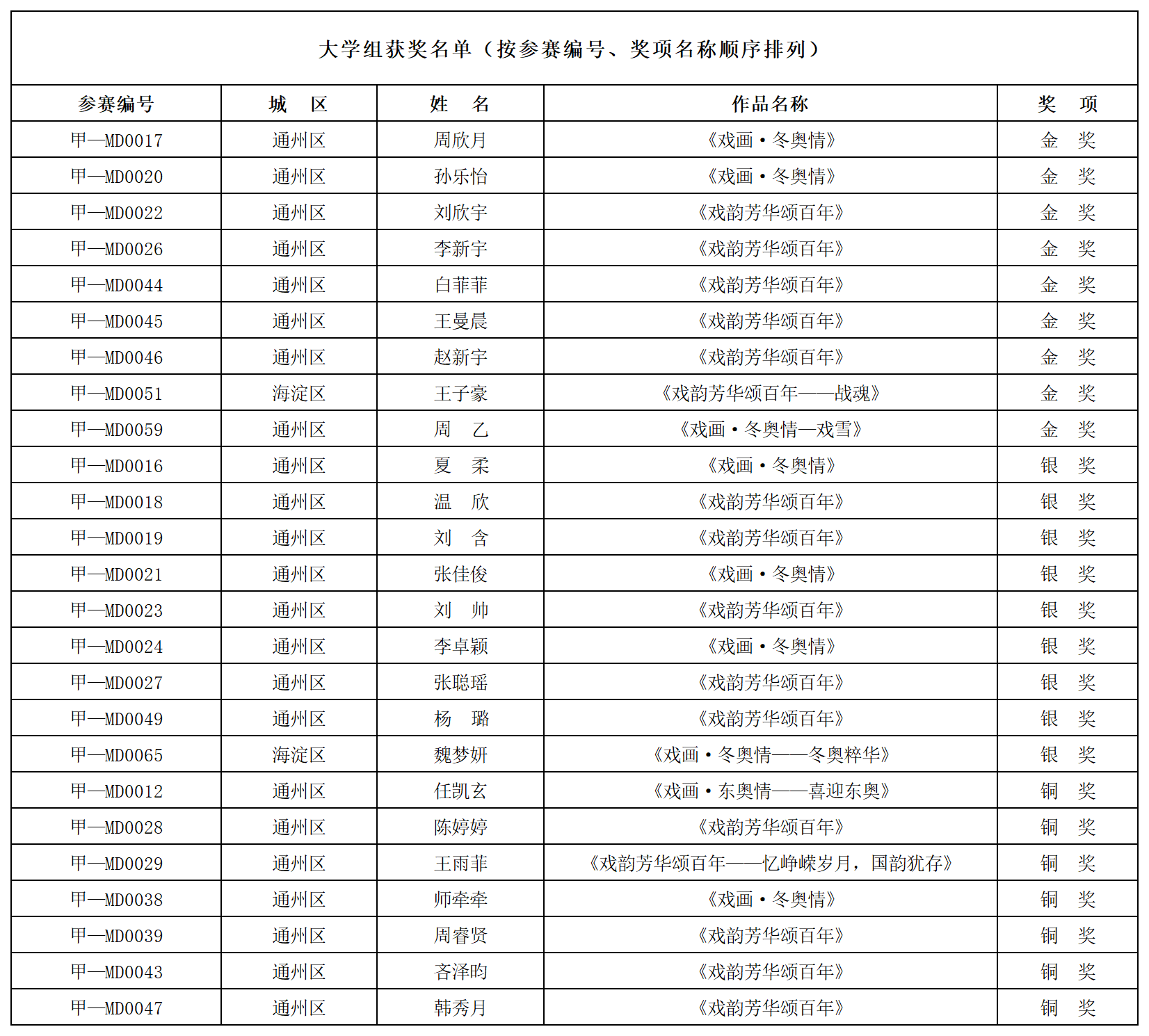 按照《北京市教育委员会关于举办第十二届国戏杯学生戏曲大赛的通知》(京教函〔2021〕471号)要求,于2021年11月中旬完成第十二届国戏杯学生戏曲大赛甲组(戏曲绘画类业余组)决赛。现将获奖名单及相关事宜通知如下: