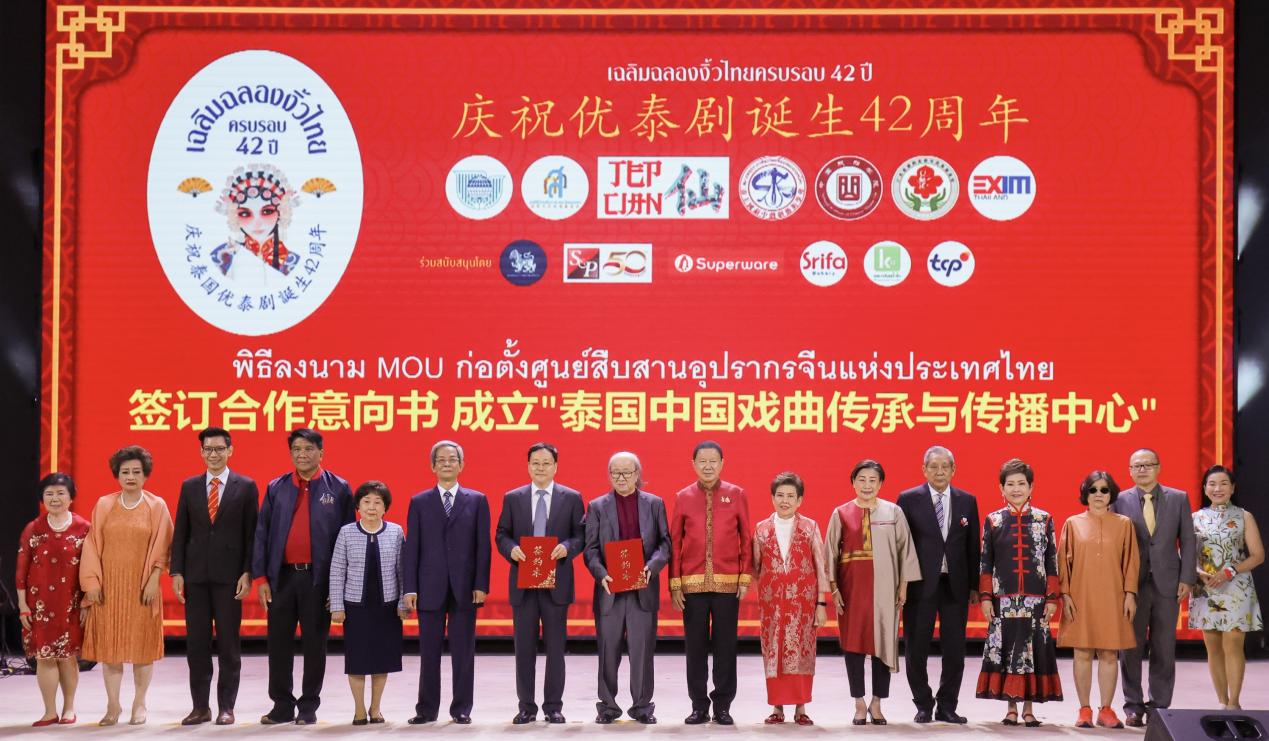 访泰期间,代表团成员出席了庆祝优泰剧诞生42周年庆典大会。李必友代表我校致辞,与泰中戏剧艺术学会执行主席庄美隆签署了“泰国中国戏曲传承与传播中心”合作意向书,国戏师生演出了京剧《石秀探庄》、越剧《黛玉葬花》、豫剧《斗笠县令》、潮剧《苏六娘》、川剧《变脸》、闽西汉剧《贵妃醉酒》等戏曲经典剧目片段,向泰国艺术团体、教育机构、华人华侨和民众生动展示了中华戏曲艺术的魅力。泰国商会暨泰国贸易院主席、语言与文化促进基金会主席洪百川,泰国前副总理、泰中文化促进委员会主席披尼•扎禄颂巴,泰国文化部次长育帕•塔威瓦塔纳吉波温,泰国优泰剧诞生42周年庆典主办方荣誉主席陈淑卿,泰王国泰中戏剧艺术学会泰方主席陈文谦,曼谷中国文化中心副主任赵歆,北京潮商会会长陈才雄等嘉宾和观众约600人出席活动。