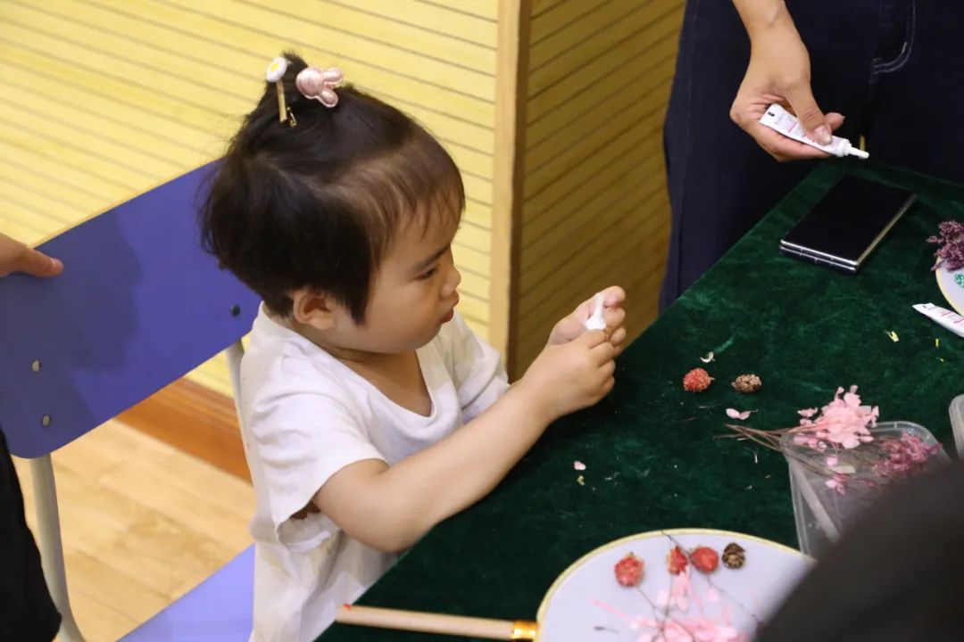 活动现场设置了“亲子手工坊”区域,教职工和孩子们一起动手制作戏曲立体画、手绘彩色风铃、手工团扇等手工艺品。孩子们充分发挥想象力和创造力,完成了一个个精美且富有童趣的作品。