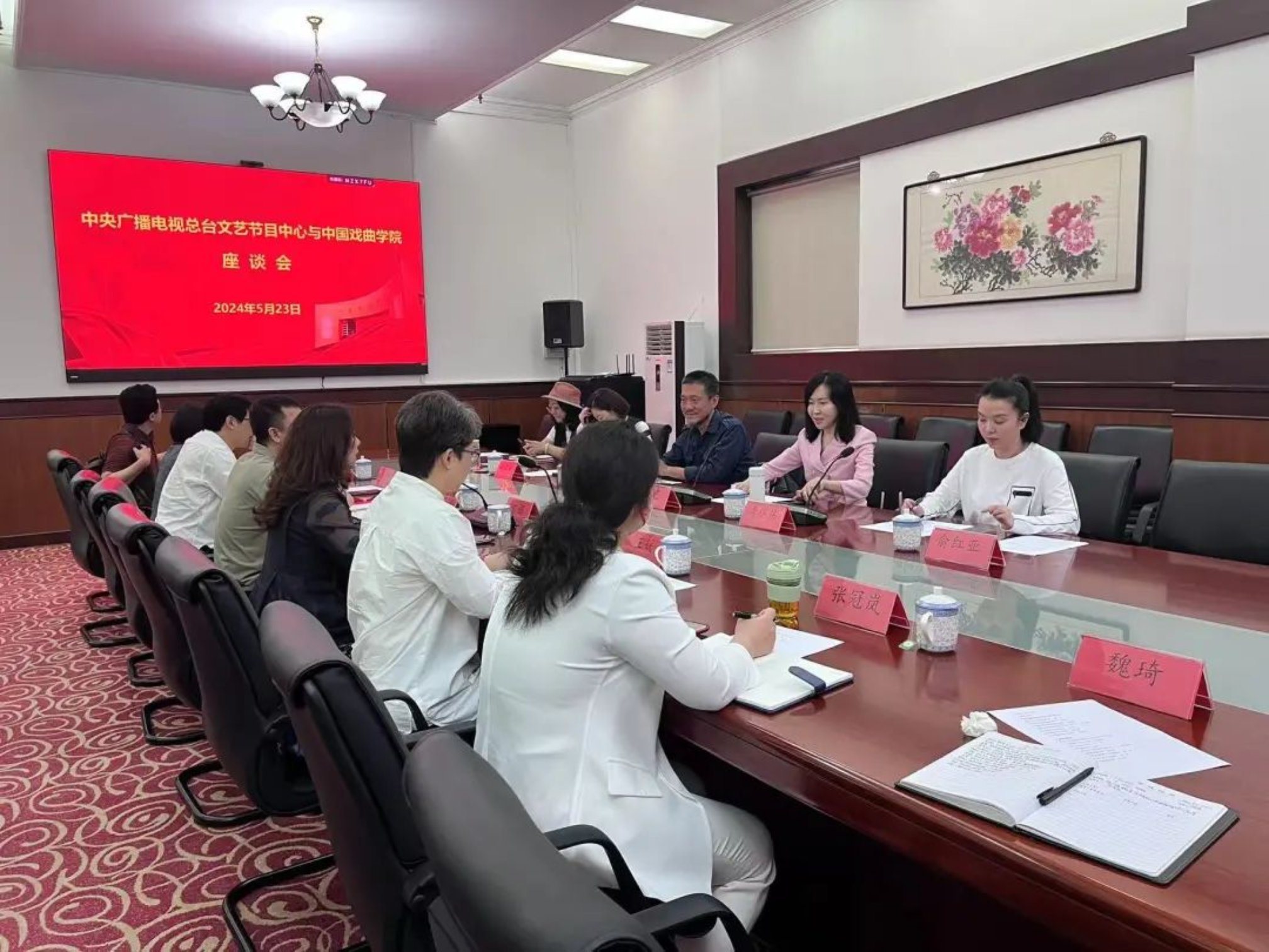 近日,中央广播电视总台文艺节目中心戏曲频道节目部副主任董艺等一行6人赴我校进行调研与合作交流。学校党委常委、副院长、附中党委书记陈娟主持会议。党委宣传部、艺术实践管理中心、京昆系、表演系、戏曲文学系、舞台美术系、艺术管理与文化交流系等部门单位相关负责同志参加。