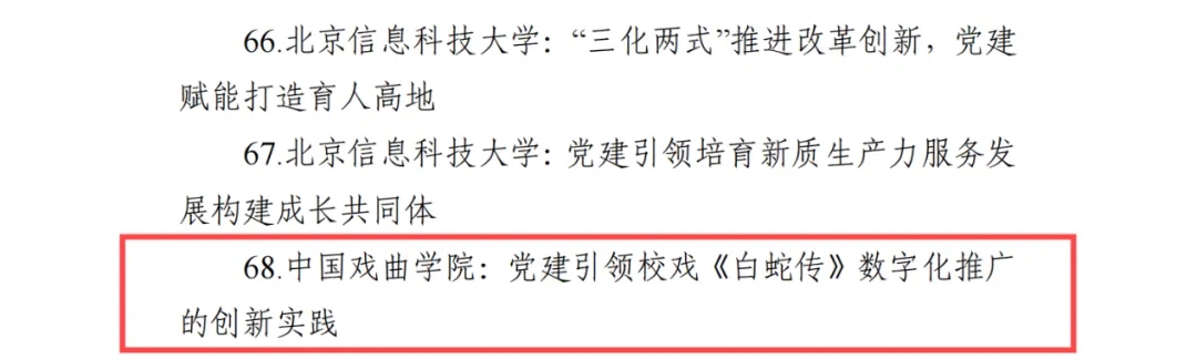 近日,北京市委教育工委公布了北京高校党建工作“标杆院系”“样板支部”“党建引领实践创新示范项目”培育创建单位名单。经学校党委推荐,市委教育工委组织同行互评、专家评议和结果公示,我校戏曲文学系研究生党支部、机关党委党群工作部党支部、音乐系教师党支部入选北京高校党建工作“样板支部”培育创建单位,党建引领校戏《白蛇传》数字化推广的创新实践项目入选“党建引领实践创新示范项目”。