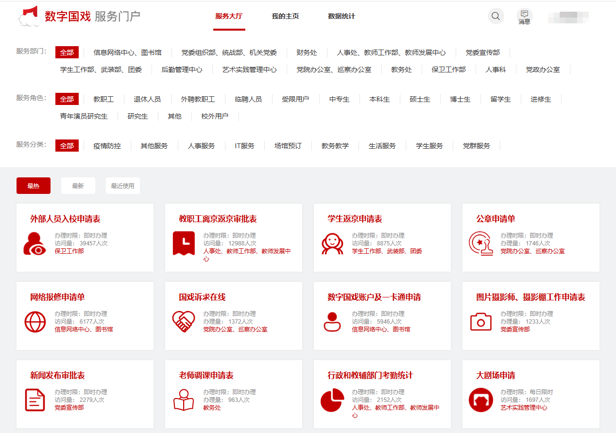 搭建便捷移动应用。通过微信“数字国戏”服务号构建智慧服务信息流,师生可随时随地获取学校各类信息和服务。以卡、码、脸等多种身份验证和支付方式支撑校园出入管理、餐饮、门禁、练功房预约等业务,实现“一机在手,走遍校园”。