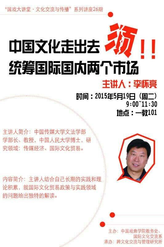 “国戏大讲堂.文化交流与传播”系列讲座26期——中国文化走出去须统筹国际国内两个市场(主讲人:李怀亮)