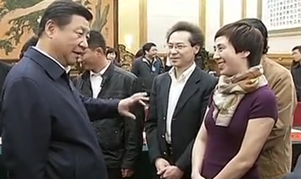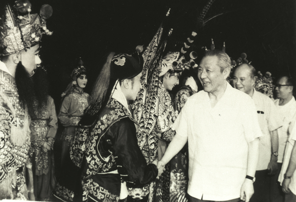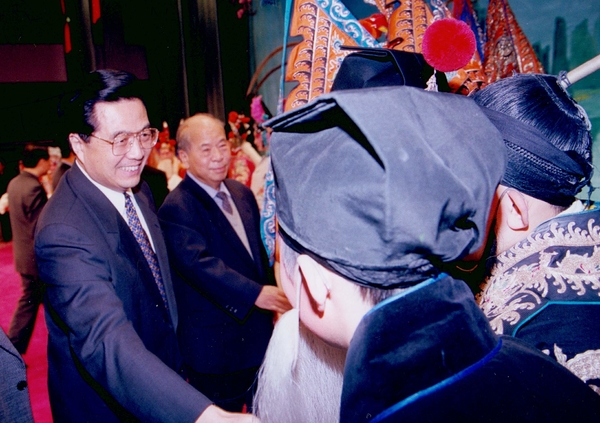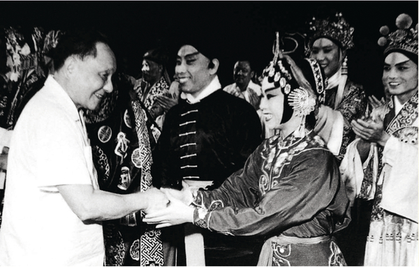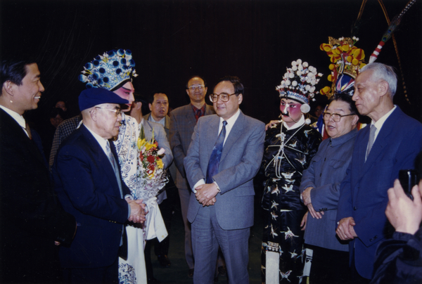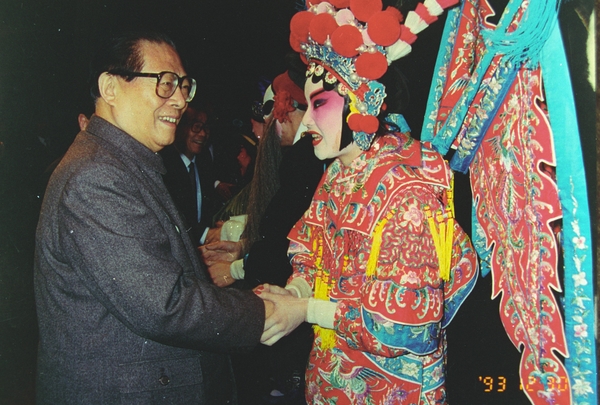 江泽民同志观看完新年戏曲晚会后,上台接见演员。中南海怀仁堂。1993年12月30日。