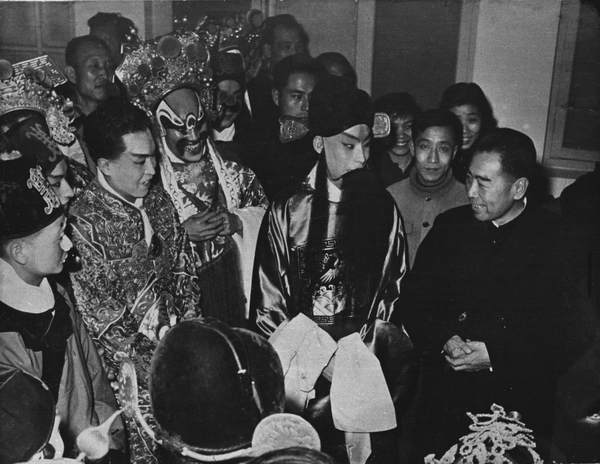 周恩来同志观看完演出后,上台与演员亲切交谈。1960年12月23日。